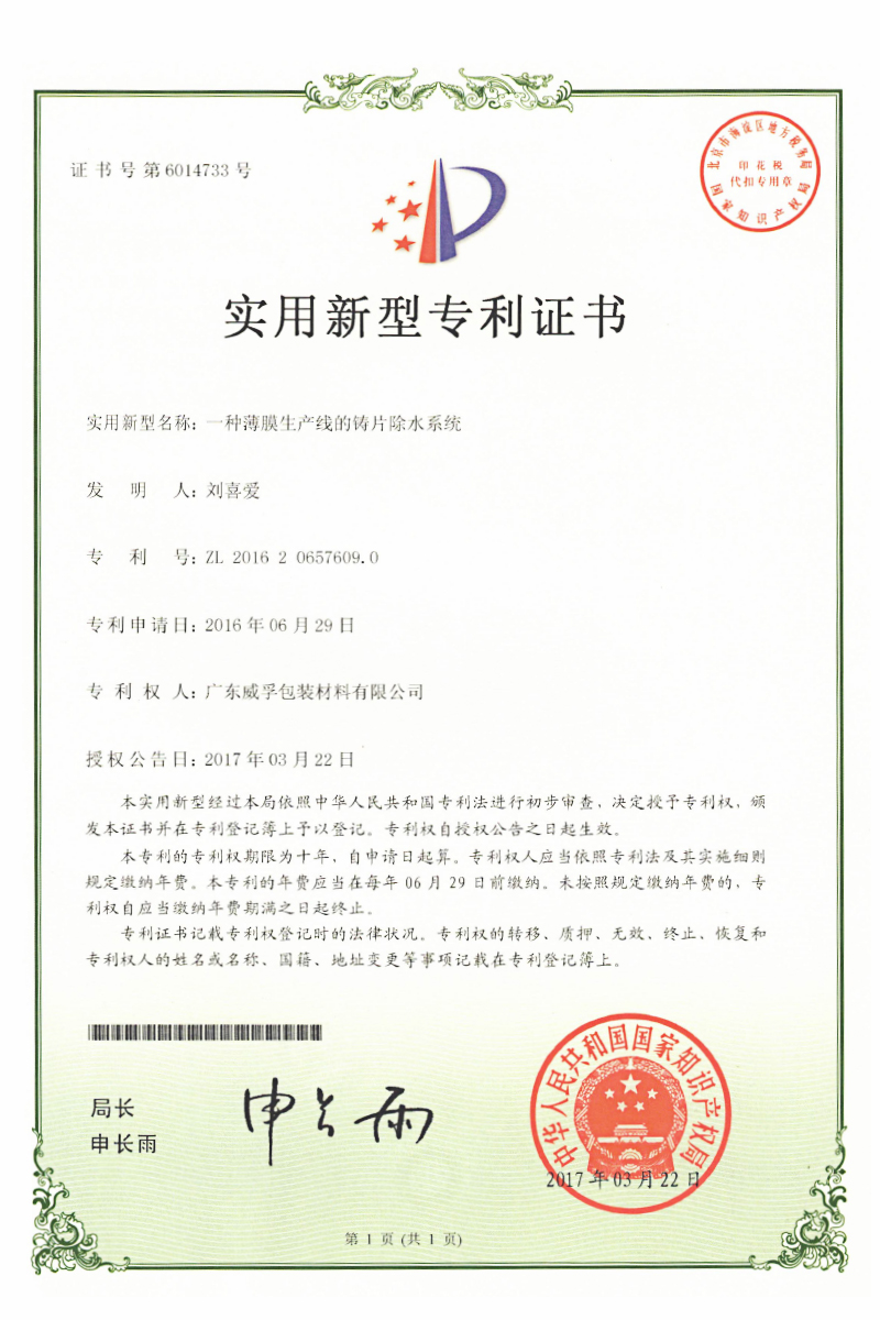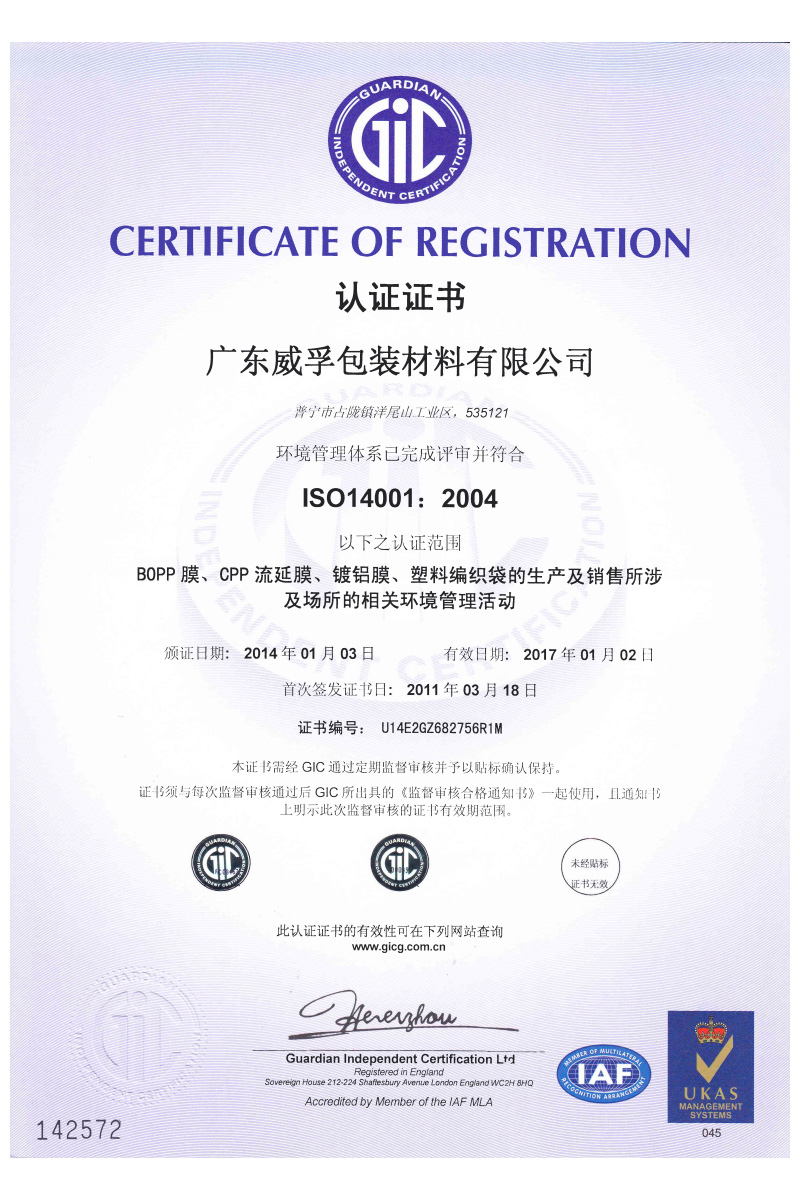 Weifu has been certified with ISO9001:2015 and ISO14001:2015. Also, Weifu’ s BOPP Line has achieved Global Recycling Standard, GRS certification, and EcoVadis social responsibility rating certification.