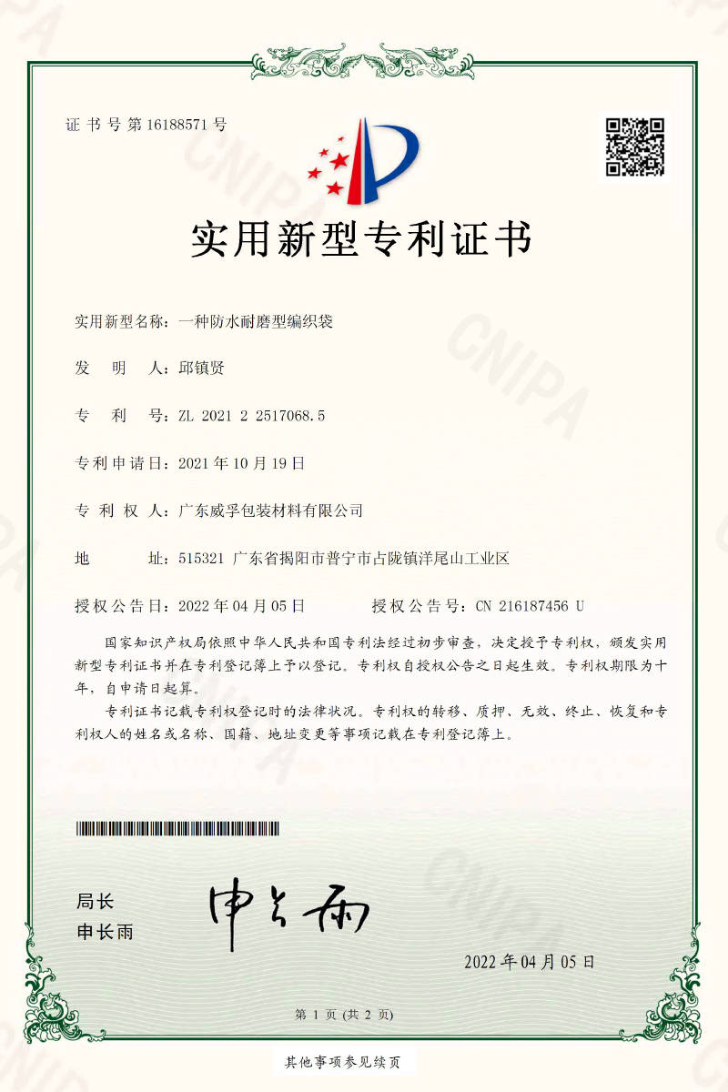 Guangdong Weifu Packaging Material Co., Ltd. was established in 2000, the predecessor can be traced back to the "Zhanlong Yangmeishan Plastic Wire Factory" established in 1981. Guangdong Weifu is located in Yangweishan Industrial Area, Zhanlong Town, Puning City, Guangdong Province, covering an area of about 180K square meters, with a registered capital of 45.2 million US dollars, a total investment of 800 million RMB and an annual sales volume of 650 million RMB.